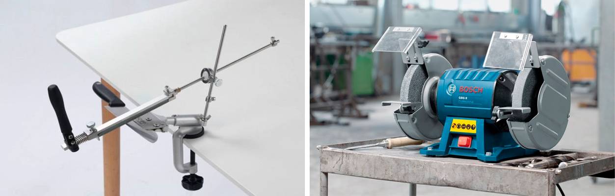 В принципе самый обычный дешевый станок, представляющий собой двигатель с вращающимся валом и заточным кругом на нем, способен заточить ножи, ножницы, стамески и другие предметы. Но для этого потребуется определенный навык, чтобы по всей длине лезвия кромку сделать одинаковой.