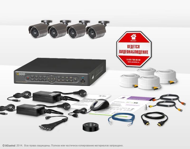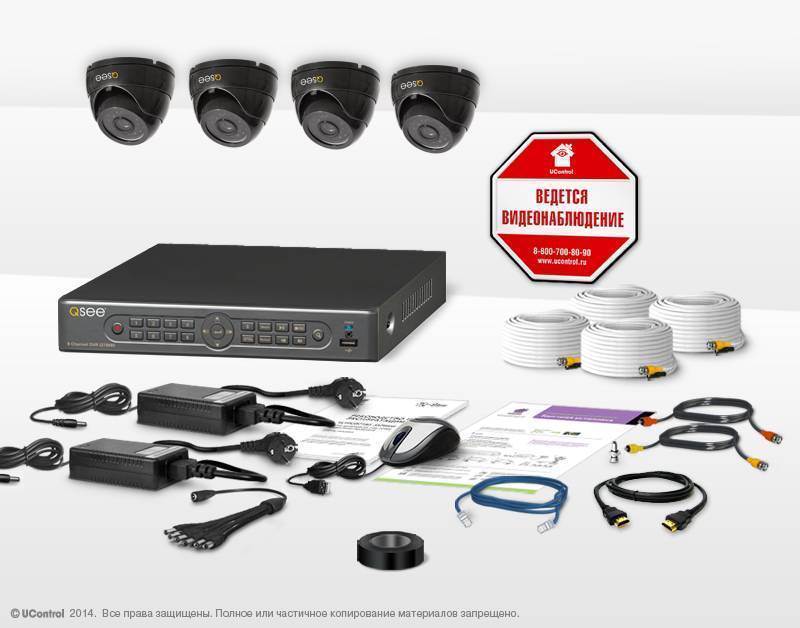 В стандартный готовый набор входит видеорегистратор с несколькими входами, соответствующее количество камер, жесткий диск для записи (опционально), блоки питания с разветвителями, соединительные шнуры, крепежные элементы, пульт управления или мышка. HDMI и AV кабели для подключения регистратора к монитору идут в комплекте, VGA кабель чаще всего покупается отдельно.
