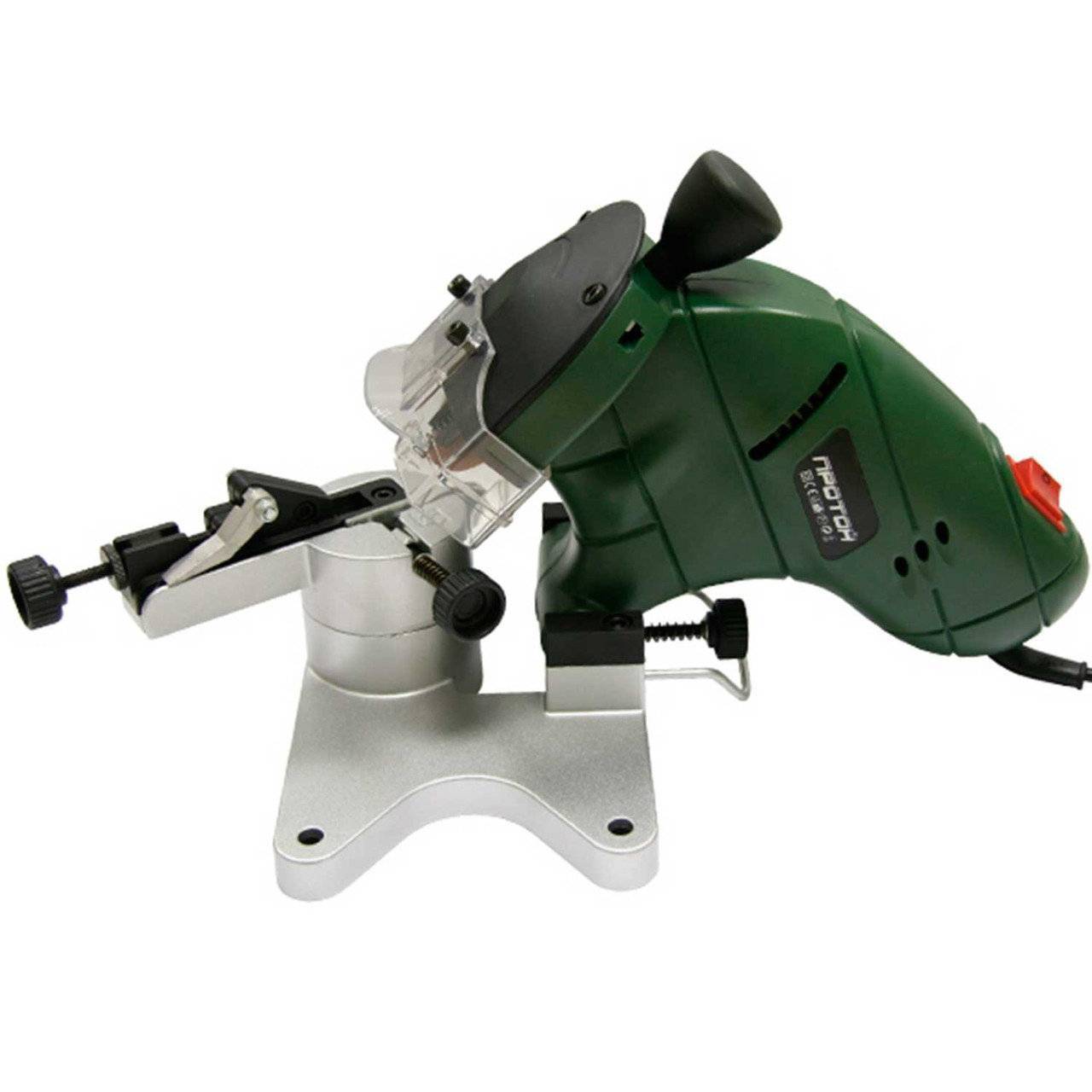 Станок для цепей отечественного производства мощностью 200 Вт. Двигатель разгоняет рабочую насадку до 6000 об/мин, поэтому заточка цепей производится довольно быстро. Диаметр заточного круга составляет 100 мм, толщина 3,2 мм, а посадочное гнездо у него 10 мм. В зависимости от типа цепи можно выбирать угол заточки от 0° до 30°. На корпусе устройства располагается ограничитель глубины заточки — он необходим, чтобы во время работы случайно не разрезать цепь избыточным надавливанием.