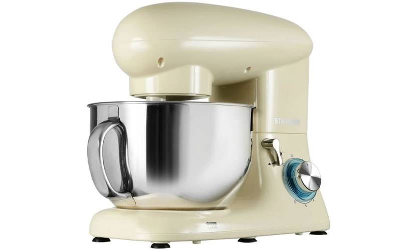 Стационарный миксер с металлическим корпусом и чашкой из нержавейки ёмкостью 4,8 л представлен в широкой цветовом диапазоне. Имеет три основные насадки — крючки для замешивания и венчик. В работе задействует 10 скоростей. Мощность — 800 Вт. В комплекте крышка на чашку.