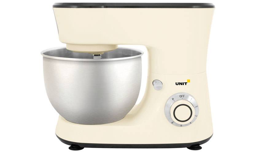 Планетарный миксер с корпусом из пластика и чашей из нержавеющей стали, ёмкость которой 5 л. Имеет 2 насадки для теста и венчик для взбивания. Работает на 6 скоростях, регулятор которых расположен на корпусе. Есть импульсный режим. Мощность — 1000 Вт. Комплектуется крышкой на чашку.