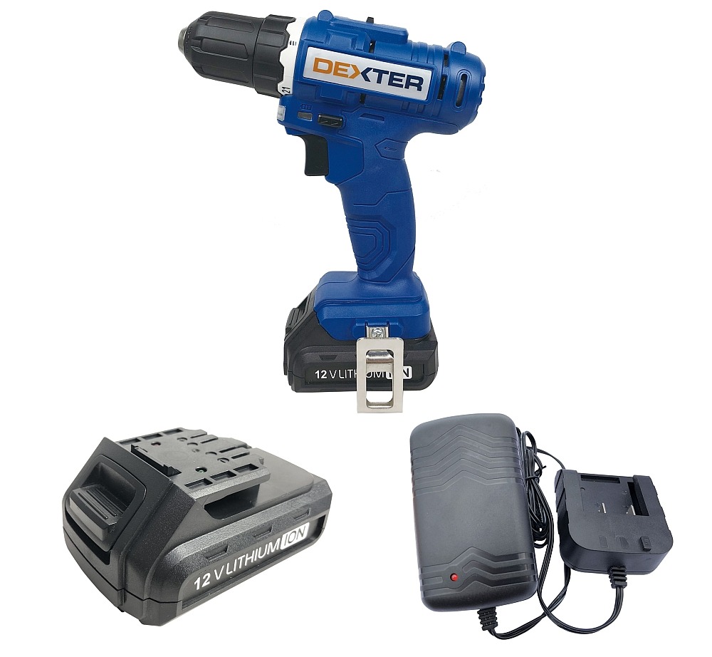 Аккумуляторная дрель-шуруповерт Dexter, Li-Ion 12 В позволяет работать с саморезами, шурупами и другим распространенным крепежом, а также сверлить отверстия в деревянных и металлических материалах. Прорезиненная рукоятка исключает проскальзывание инструмента в руке. Маленький вес устройства — всего 2,4 кг — делает его незаменимым при монтажных работах. Удобности также придает батарея, не выступающая за пределы ручки, как у большинства моделей шуруповертов. Заряжается инструмент в течение часа. Крутящий момент имеет 17 различных режимов плюс режим сверления. Максимальный — 25 Н*м. Частота вращения — 0-400 и 0-1500 об/мин.