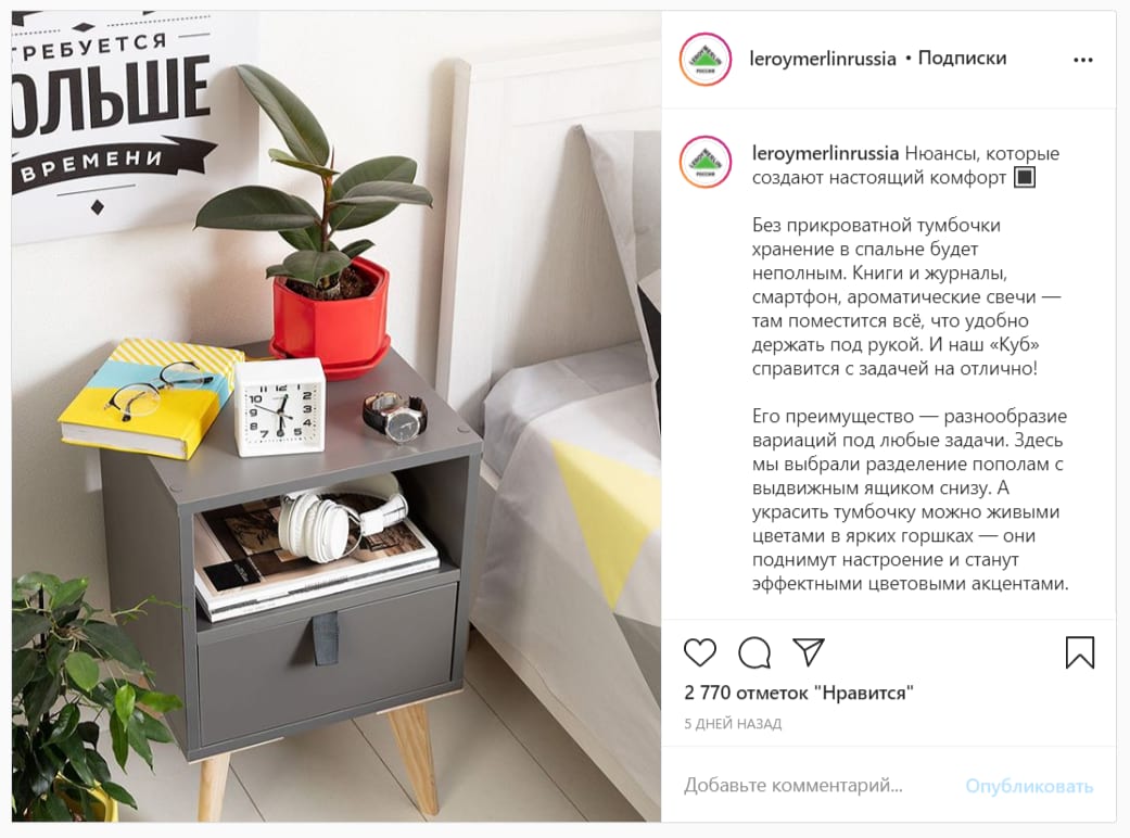 Например, в Instagram* расписывают свойства прикроватной тумбочки «Куб»: автор говорит о полезных функциях (на нее можно положить телефон) и вариациях, которые доступны в магазине. В финале автор говорит об украшении – цветах в горшках, которые «поднимут настроение и станут цветовым акцентом».