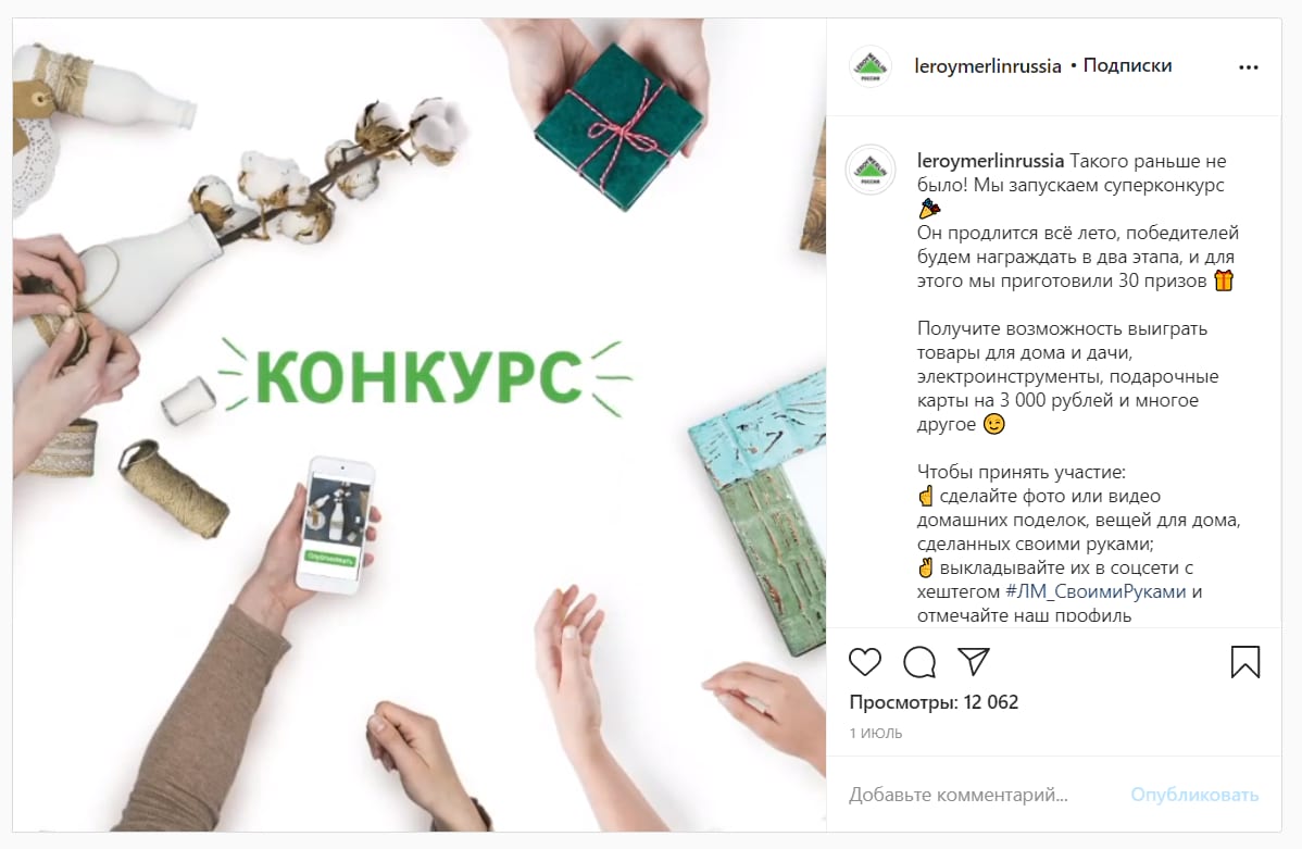 Также Леруа Мерлен несколько раз в год проводит конкурсы – скорее не как способ повысить активность аудитории, а повысить упоминаемость бренда в соцсетях. Например, в этом конкурсе просят сделать снимки с поделками из гипермаркета и выложить их в сторис.