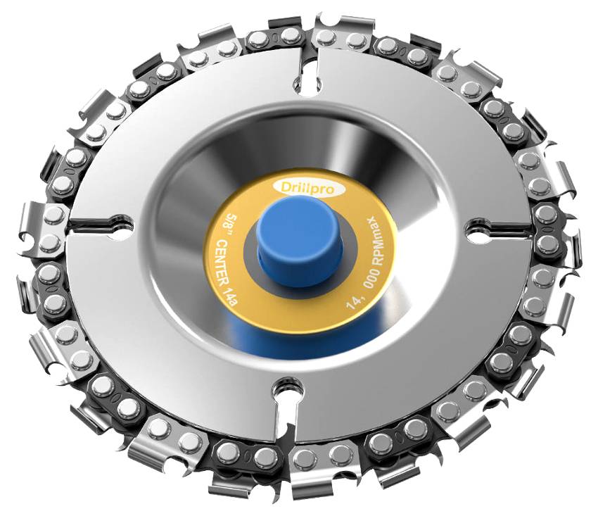 - Цепной — имеют вид диска, только по наружной окружности вместо зубьев располагается цепь, как на бензопилах. Такой тип насадок является более безопасным, и им можно резать древесностружечный массив средней плотности. На кругах такого типа опасность заклинивания и возникновения обратного удара сведена к минимуму. Достигается это за счет специальной конструкции насадки, которая подобна шине бензопилы. Круг состоит из двух частей, а с торцевой стороны имеется паз. В этом пазу располагается пильная цепь, перемещающаяся за счет силы инерции. Такая конструкция исключает заклинивание диска, и тем самым является более безопасным вариантом, по сравнению с первым типом. Категорически противопоказано пилить древесину с гвоздями. Зубья при этом быстро тупятся, и выходят из строя