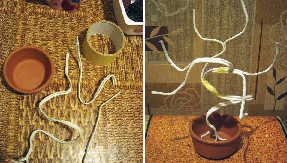 Подставку для такого топиария лучше выбирать из цветочных горшков. Имитация растения-бонсай с такой основой будет более очевидна.