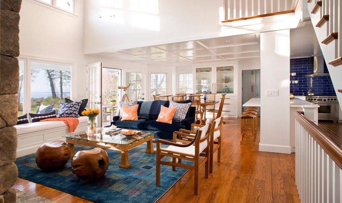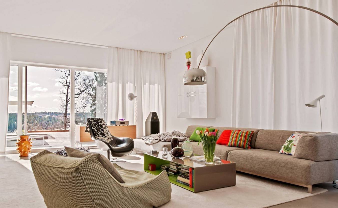 Чтобы сделать интерьер гостиной более комфортным и расслабляющим, дополните его круглыми формами и узорами. Простой способ поднять потолок – декорировать стены вертикальными полосами.