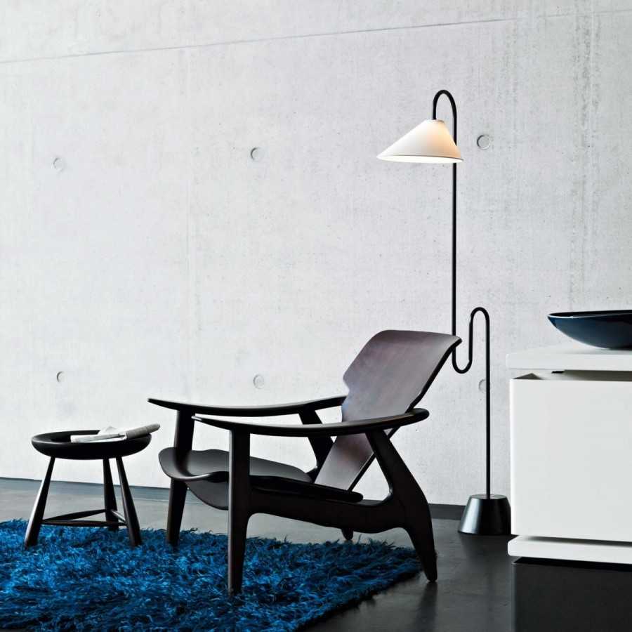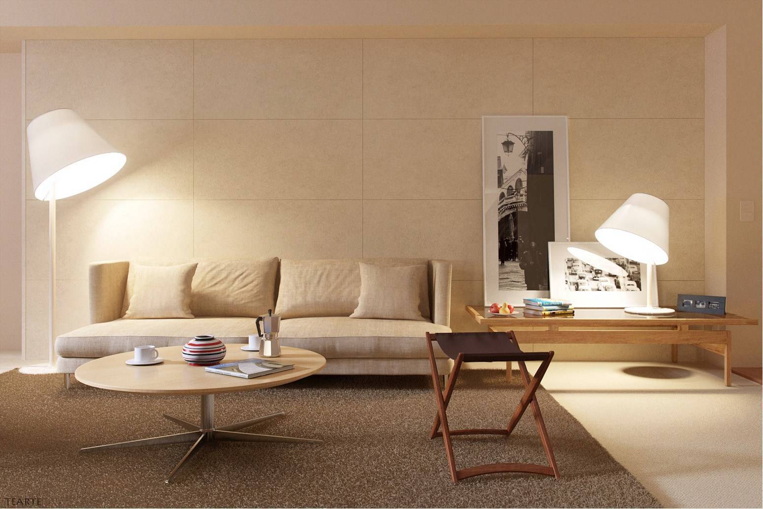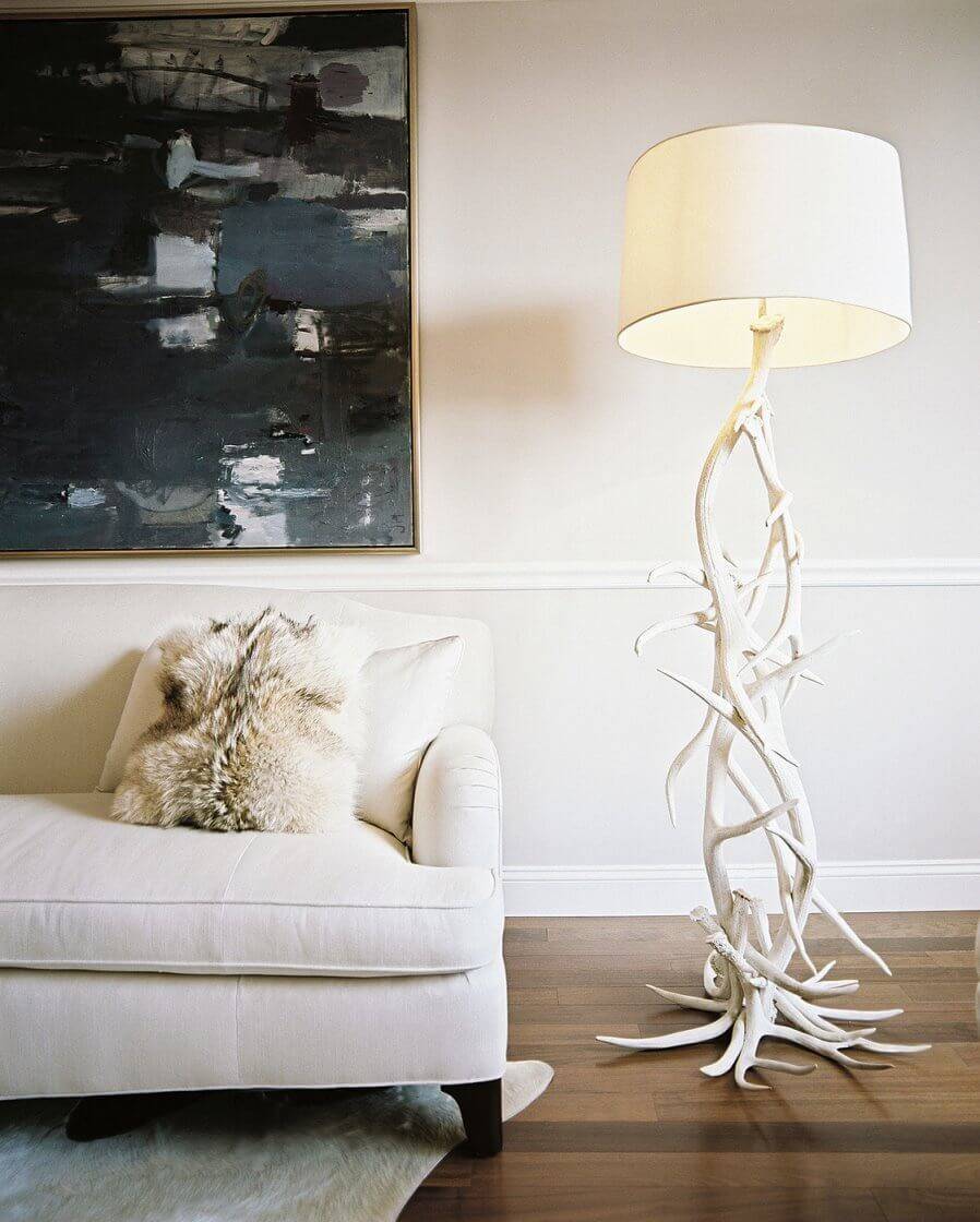 На фото минималистичный интерьер гостиной, декорированный торшером с деревянной ножкой.