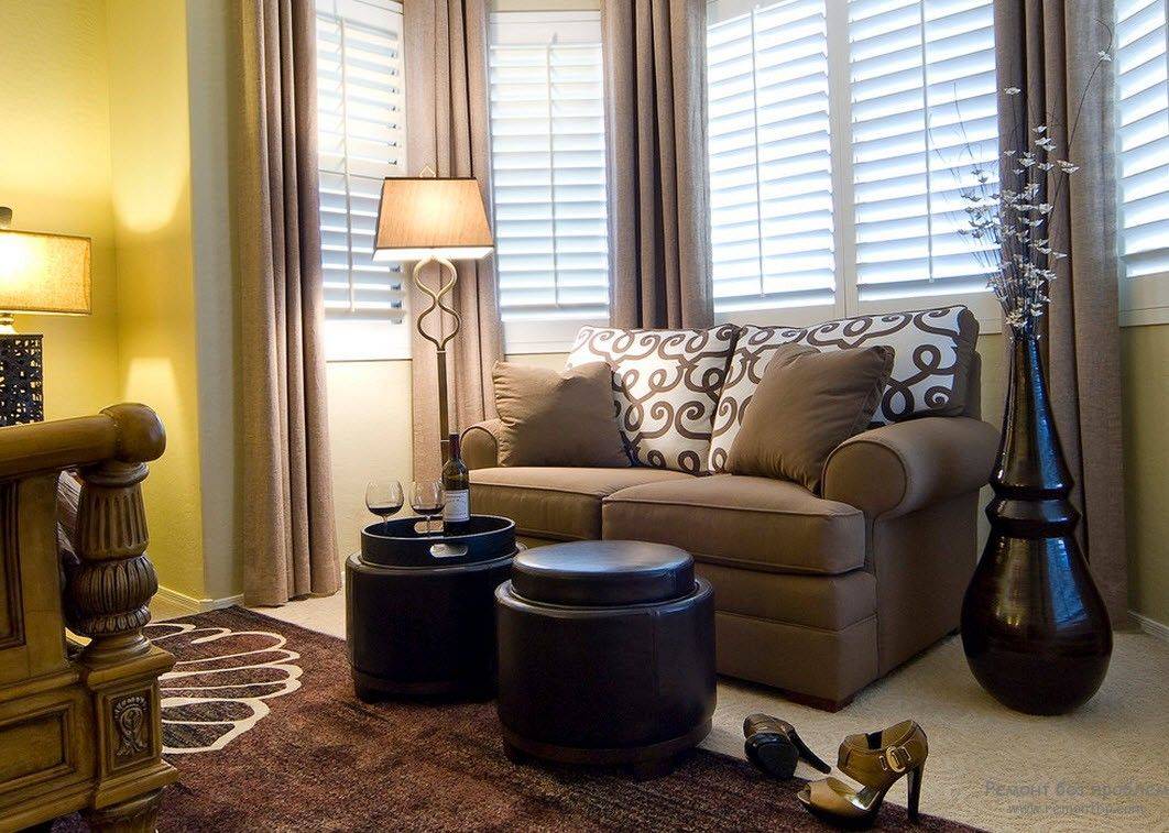 Кроме того, текстиль, включая обивку мебели, должен сочетаться по цвету со стенами и напольным покрытием. Соединительный декоративный элемент может быть изготовлен из подушек нестандартных размеров с оборками из той же ткани, что и шторы.