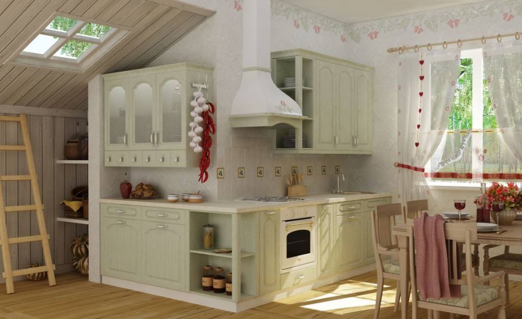 Кухонное оборудование отвечает созданию деревенского стиля. Луковичные и чесночные косички следует вешать на стены, придавая им особый вкус. Пучки перца чили и пучки трав под потолком. Окна вымыты ситцевыми шторами в виде маленького цветка, а поверхности, покрытые тканными салфетками ручной работы, создают неповторимый уют загородного дома: