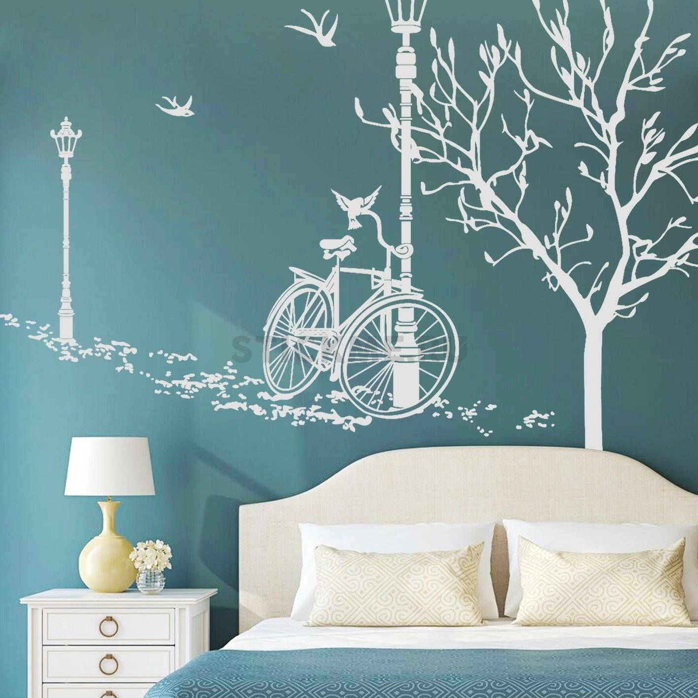 Чтобы добиться эксклюзивного дизайна, можно перенести часть рисунков на шкафы, зеркало или на само изголовье кровати.
