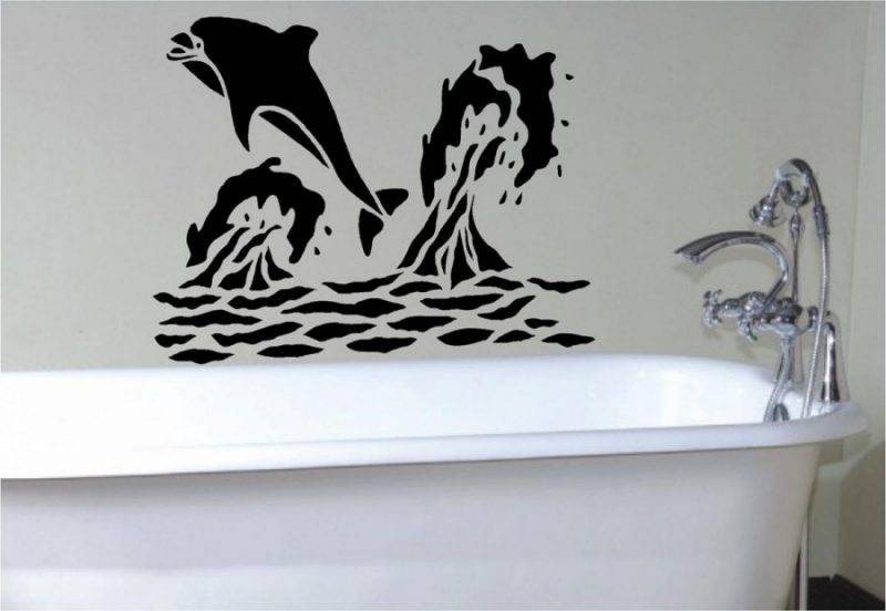 Чаще всего для украшения стен используют однотонные трафареты. Самым распространённым цветом для выполнения рисунков является черный. Если подключить фантазию, то можно придумать подходящее, тематическое изображение, которое будет уникальным и украсит интерьер вашего дома. Например, это может быть изображение русалки, выныривающей из ванны, кошки на холодильнике или мышки, выглядывающей из своей норки внизу стены, около плинтуса.