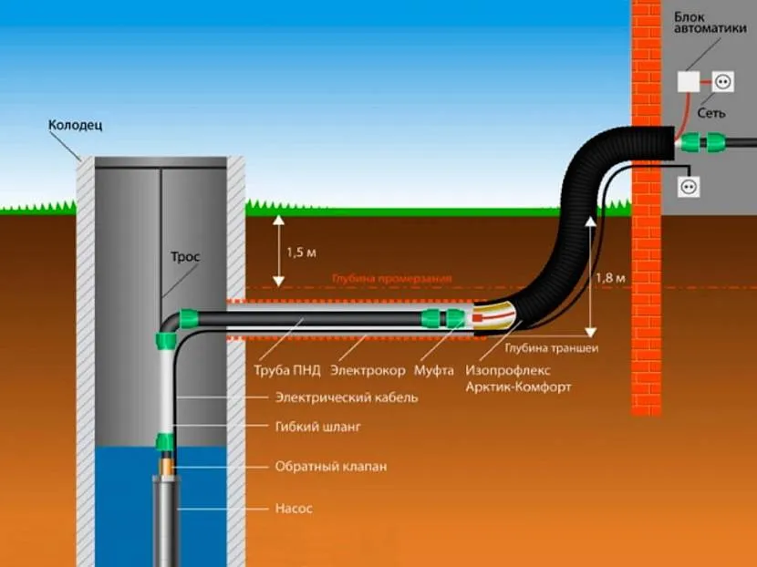 Схема прокладки водопровода с греющим кабелем от колодца Источник aquacop.ru