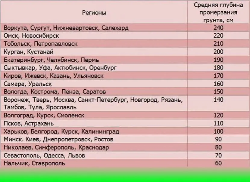 Глубина промерзания почвы зависит от климатических условий в регионе и варьируется от 30 до 300 см. Какова она в вашей местности, можно узнать в архитектурном управлении, коммунальных службах или местных строительных организациях. Либо воспользоваться таблицей средних значений по регионам.