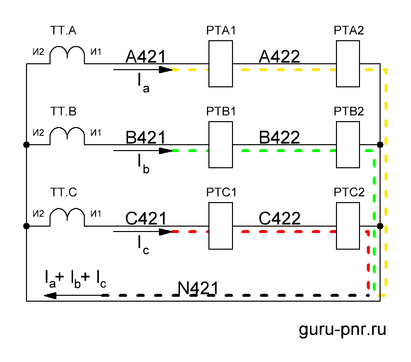 Распространенная схема: трансформаторы тока устанавливаются во всех фазах. В каждой фазе устанавливается защитное реле. А замыкается цепь через один общий провод, называемый “нулевым”.