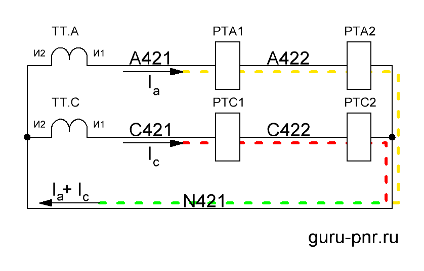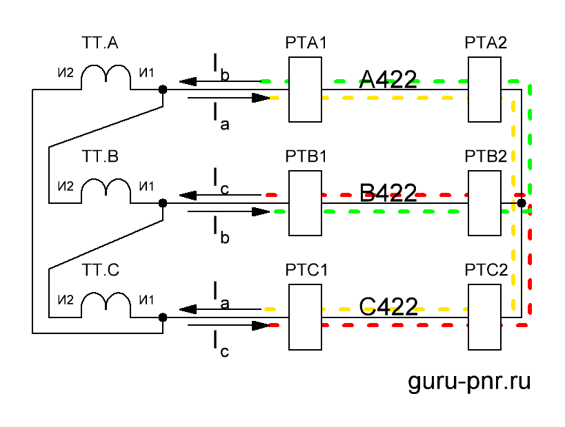 Вторичные обмотки трансформаторов тока соединяются последовательно: начало ТТ фазы A – с концом ТТ фазы B, начало ТТ фазы B – с концом фазы C, начало ТТ фазы C – с концом ТТ фазы А. Обмотки защитного устройства подключают к выводам И1 фаз A, B и C и соединяются в звезду.