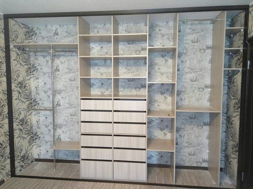Внутренности мебели, ее размеры зависят от таких факторов, как предполагаемая площадь монтажа и предназначение. Когда нужно поместить большее количество вещей, то изготавливают короб глубиной до 80 см. Стандартом для спален, гостиных считается глубина 600 мм, для прихожих 450-600 мм. На заказ изготавливается шкаф индивидуальных размеров.