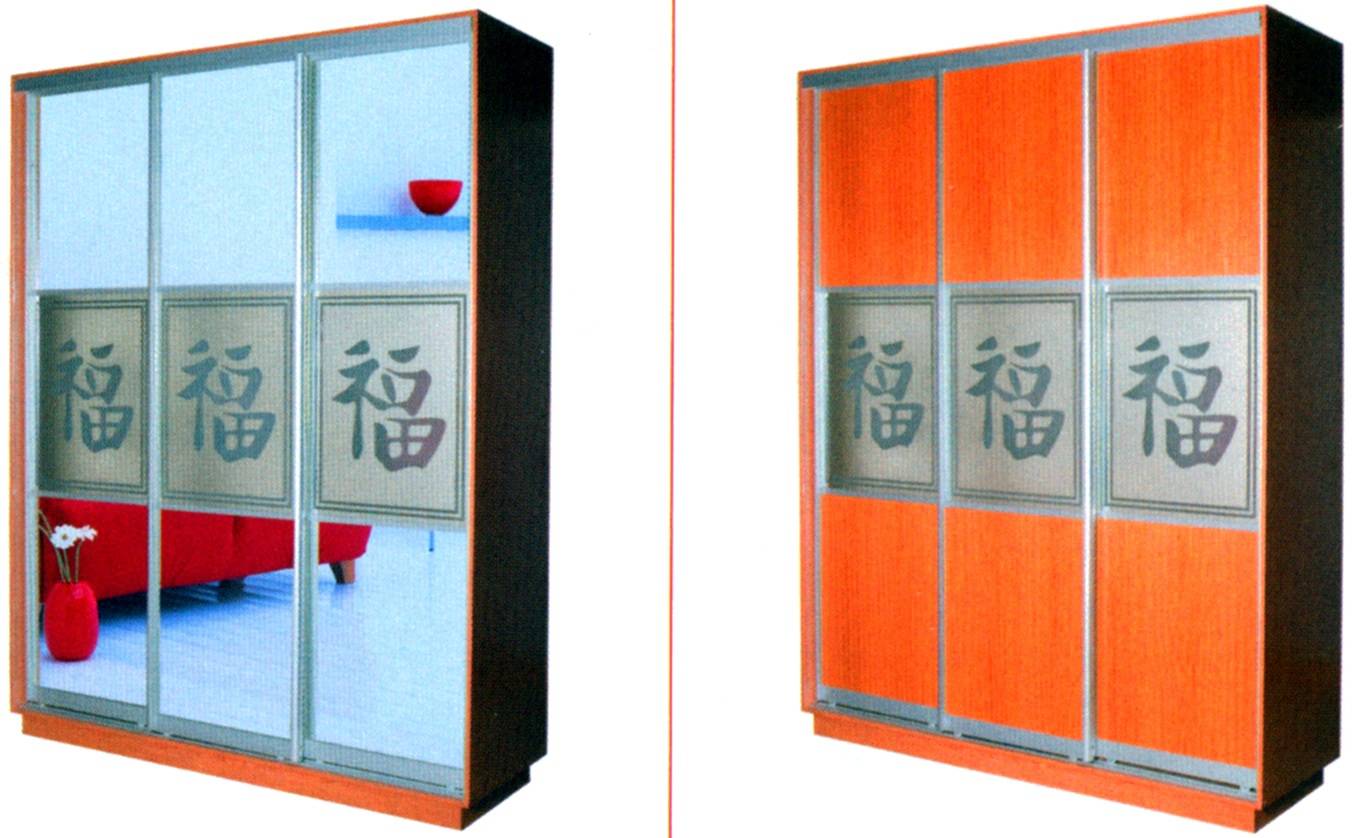 Для изготовления фасадов трехстворчатых шкафов используются те же материалы в комбинации с матовым, глянцевым или прошедшим пескоструйную обработку стеклом, зеркалами, декоративными панелями (композитными или на основе природного сырья). По желанию фасадная поверхность украшается принтом или пленками, имитирующими натуральные материалы.