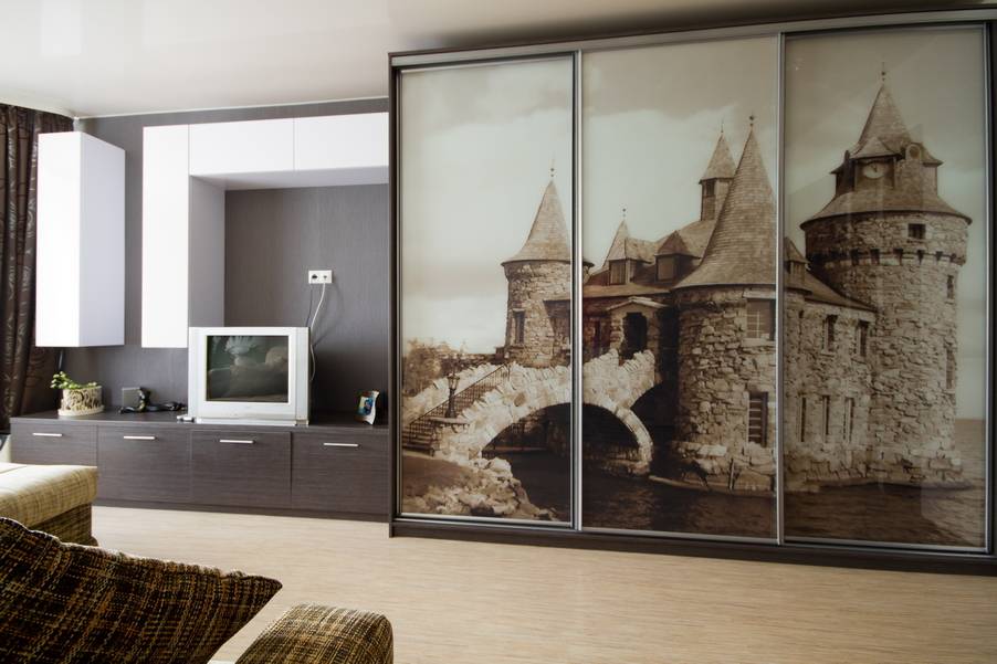 В небольших квартирах часто устанавливают шкаф с тремя дверьми в гостиной. Такие конструкции носят комбинированный характер. Средняя внутренняя секция служит для домашней аппаратуры (музыкального центра с колонками, телевизора), боковые отделения для хранения одежды. Благодаря использованию зеркал, дверей из композитных материалов, подсветкам он естественным образом вписывается в интерьер комнаты.