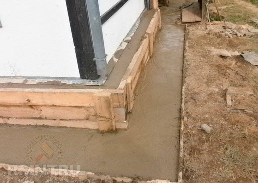 - Возвести арматурную сетку, сделать опалубку (5-15 см. до основания) и залить все бетоном.