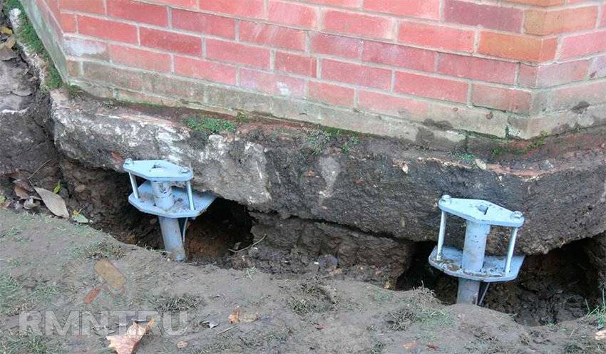 Кирпичное здание невероятно трудно приподнять с целью разгрузки поврежденного участка его фундамента без угрозы его разрушения. Поэтому необходимо будет закрывать и фиксировать появившийся сквозной пролом, накладывая с боков укрепляющий и стягивающий пояс.