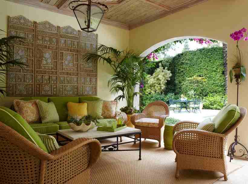 - Второе — мебель должна быть деревянной. Это могут быть элементы в классическом стиле из натурального дерева. Более доступные по стоимости изделия из шпонированного МДФ. Также приветствуется использование легкой и уютной плетеной мебели из настоящей лозы или ротанга;