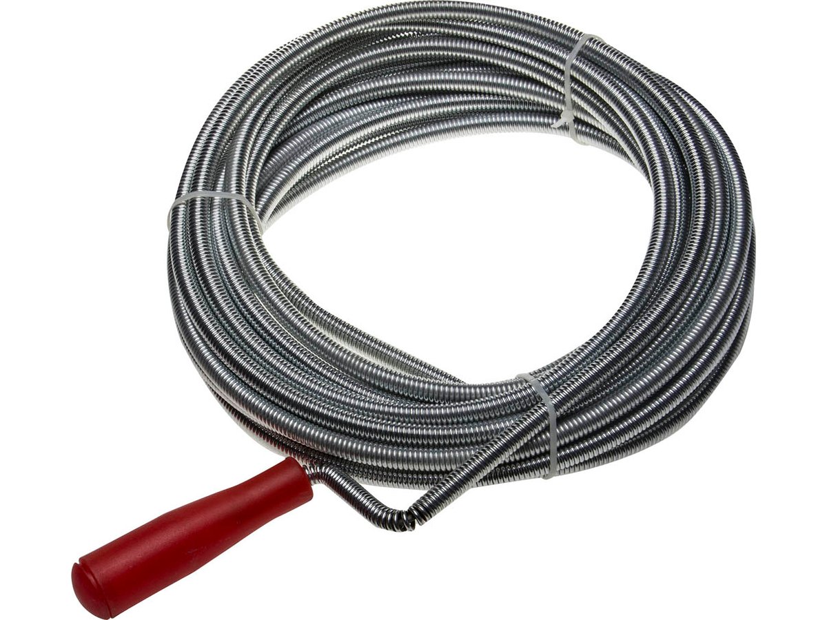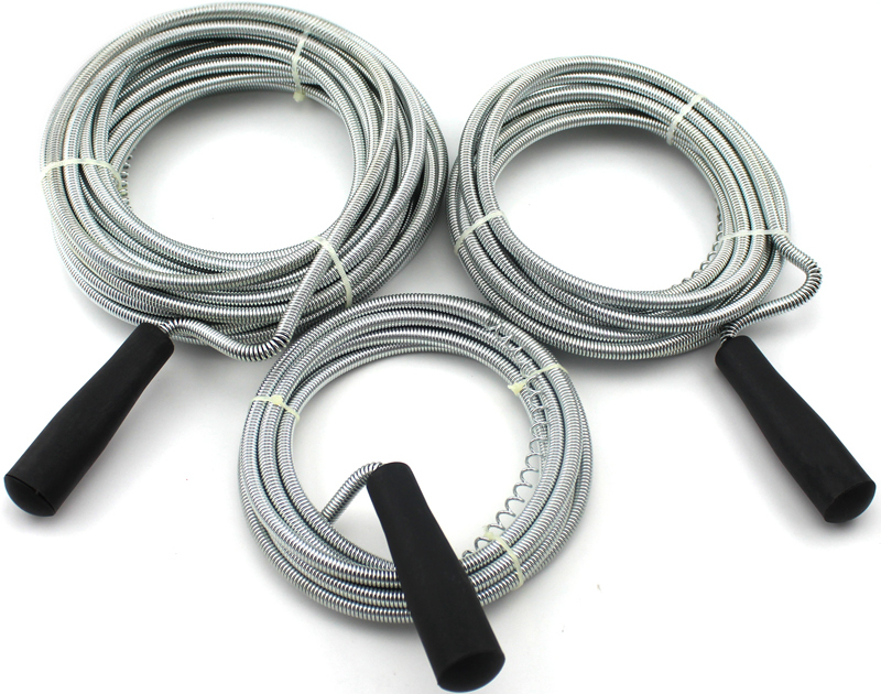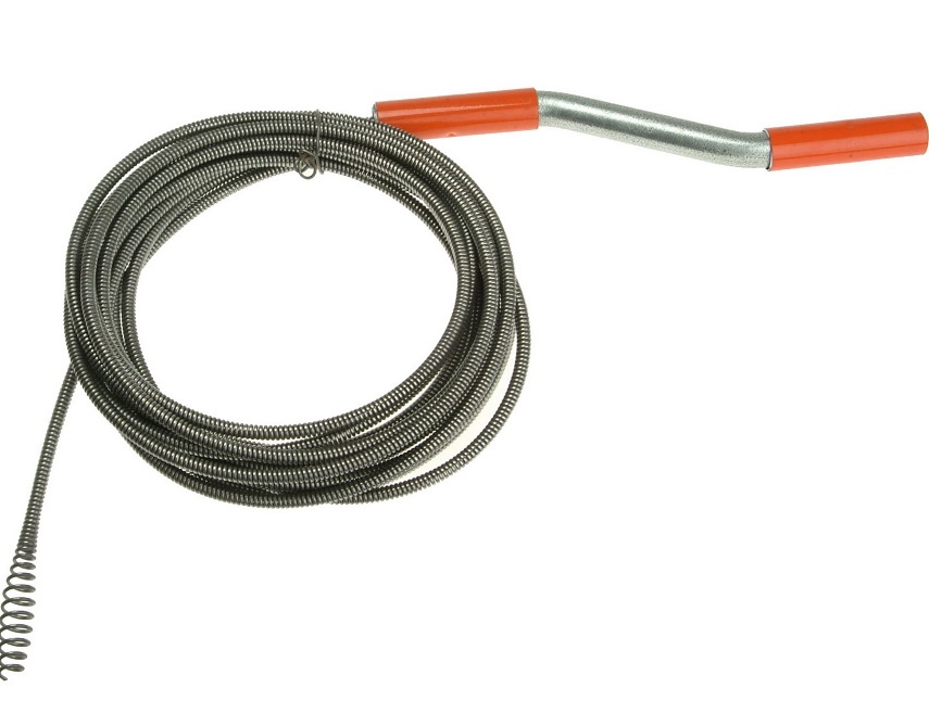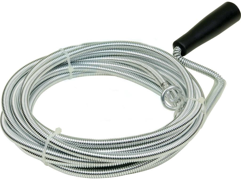 Пружинный похож на гибкий вал, состоит из витой пружины. Длина – до 25 м, диаметр – до 13,5 мм. Пружинные изделия в пластиковой оплетке используют для прочистки пластиковых труб, чтобы не повредить изнутри сами трубы, а также полости сантехники.