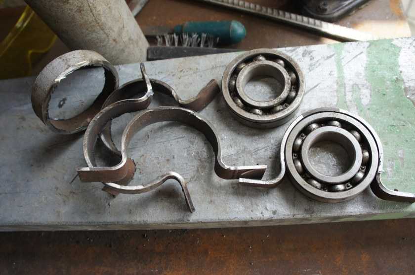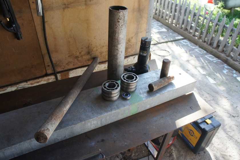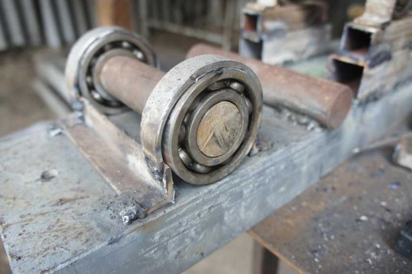 Лучше под рукой ничего не нашлось и в качестве осей использовались шпильки большого диаметра. Решение неудачное, поскольку на месте срезанных болгаркой витков резьбы остаются неровности, которые создают дополнительную нагрузку при вращении.
