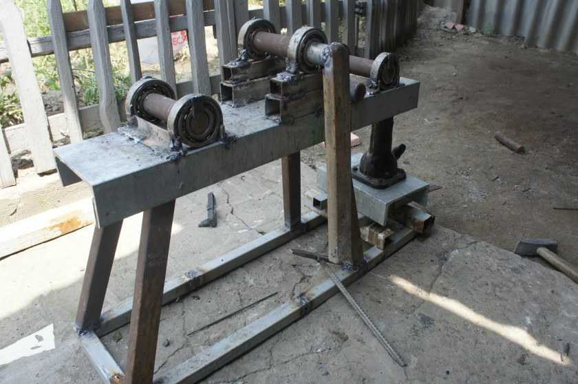 На центральный ролик наварены тычки, чтобы заготовка не проскальзывала. Иногда труба буксовала и с ними. В таком случае приходилось приопускать домкрат, чтобы уменьшить натяг и делать один лишний проход.