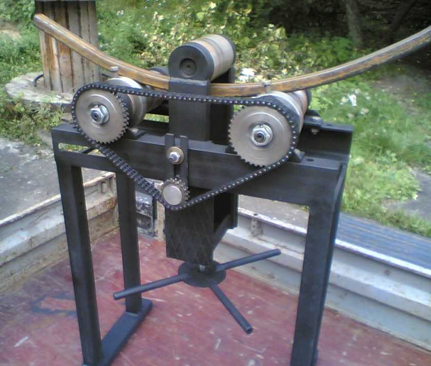 Самодельный трубогиб для профильной трубы на основе проката подразумевает, что заготовка будет уложена на боковые ролики, а сверху прижата третьим. После фиксации трубы в этом положении останется только привести посредством цепной передачи в движение валы для достижения нужного изгиба.