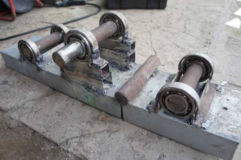 - в полученные в швеллерах отверстия вставить оси (пальцы) и закрепить на них ролики в качестве упоров для заготовки;