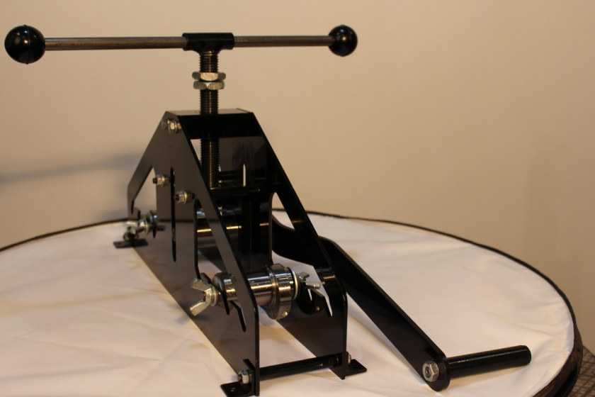 Для того чтобы понять, что такое устройство отличается простотой конструкции и применения, достаточно взглянуть на его фото или чертеж. В зависимости от того, какие нагрузки предполагаются для трубогиба этого типа, основание для него изготавливается из металла или прочной фанеры. П-образный держатель, на котором будут размещены центральный и прижимной ролики, делают из металла.