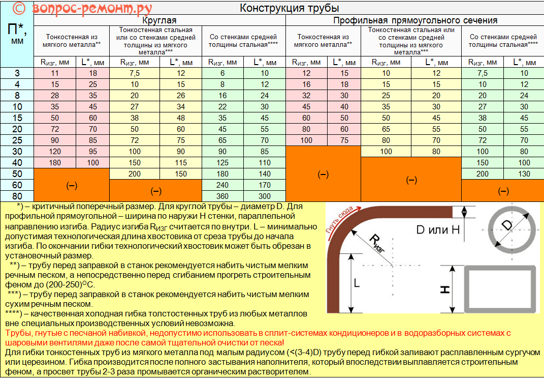 Если не соблюдать рекомендации из таблицы, то превышение нормы повлечет за собой нарушение целостности материала. Если надо согнуть трубу меньшего радиуса, чем указано в таблице, следует прибегнуть к применению горячего метода вальцевания, использующиеся в производственных условиях.