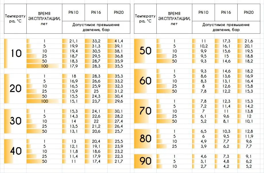 Начнем с того, что ПП-трубы лучше чем ПВХ переносят воздействие высоких и низких температур, выдерживают высокое давление. Поэтому их используют даже для обустройства систем горячего водоснабжения и отопления. Какое давление выдерживает полипропиленовая труба 20 мм, чаще всего применяемая в этих системах, зависит от температуры, которая может достигать 60-90 градусов. Но 6 атмосфер выдержит точно, тогда как обычно оно не превышает 3-4,5 атмосфер.