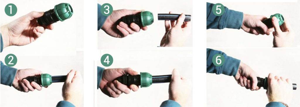 Дачный водопровод из полиэтиленовых труб проще всего смонтировать при помощи компрессионных фитингов. Процесс не займёт много времени и не потребует особых навыков. Компрессионные муфты сначала разбирают и навинчивают на соединяемые концы труб, устанавливая прокладку и зажим. Фиксация соединения производится при помощи внешней зажимной гайки. При её закручивании нельзя использовать разводные ключи и прочий подручный инструментарий. Закручивать гайку следует только при помощи мускульной силы рук во избежание повреждения муфты.