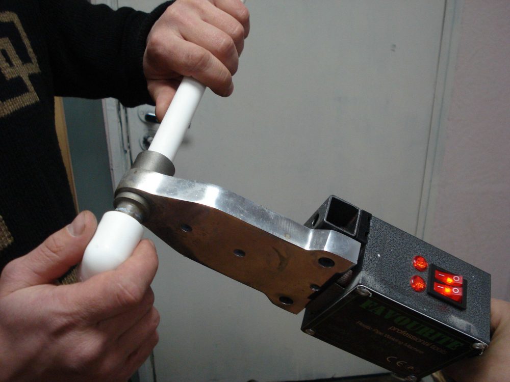Пайка. Сварочный аппарат нужно включить и подождать, пока он прогреется до нужной температуры. Как правило, это +210-260 градусов. Взять детали и надеть их на насадки. По мере нагрева детали смещаются глубже в насадку. Надо, чтобы они достигли упора. Далее насадка снимается, а детали быстро соединяются друг с другом. При этом трубы нужно аккуратно вжимать друг в друга. Прокручивать детали вокруг оси нельзя