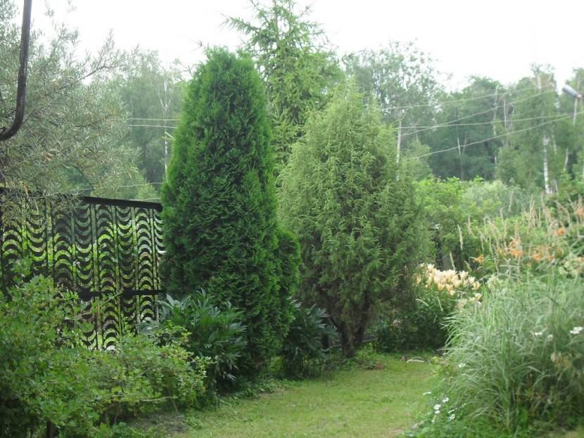 Хвойники, хорошо растущие в средней полосе России: туя, тис, пихта (бальзамическая, корейская), ель (голубая, обыкновенная, канадская), лиственница, кедр и можжевельник (казацкий, обыкновенный, горизонтальный, китайский).