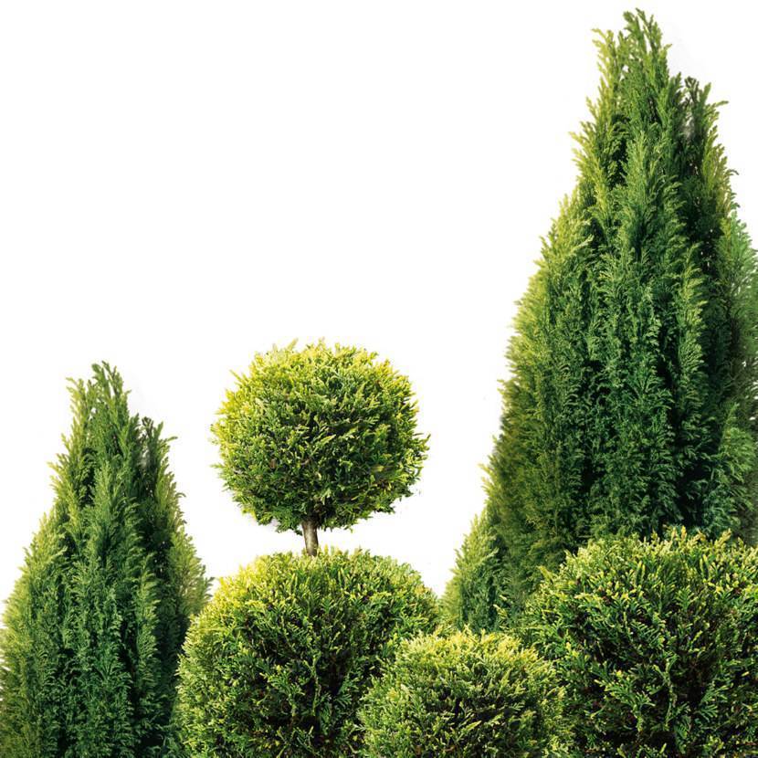 Туя: семейство кипарисовых. Вечнозелёный кустарник, вынослив в городских условиях. Наиболее распространены: туя Даника и Смарагд. Высаживается одиночно и группами.