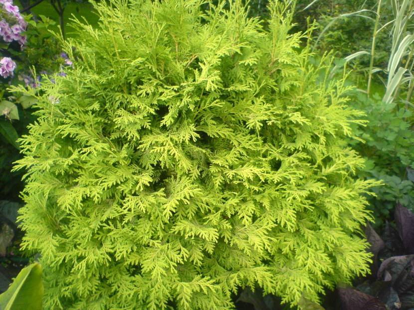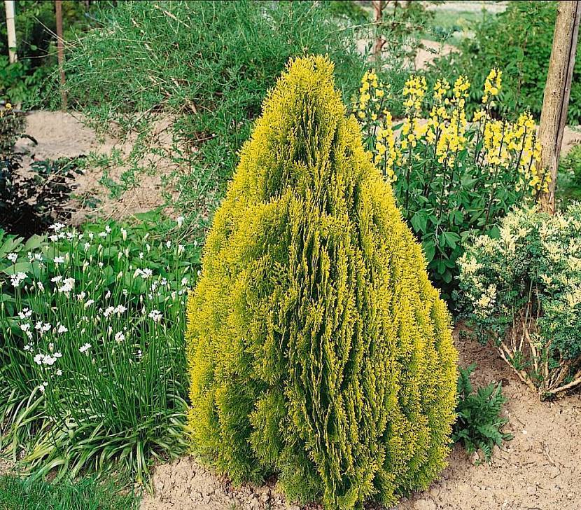 - «Глобоза Нана». Сорт «Глобоза Нана» привлекает многих ландшафтных дизайнеров благодаря необычному и яркому желто-зеленому цвету кроны. Кроме того, форма хвои растения довольно необычна и напоминает чешуйки.
