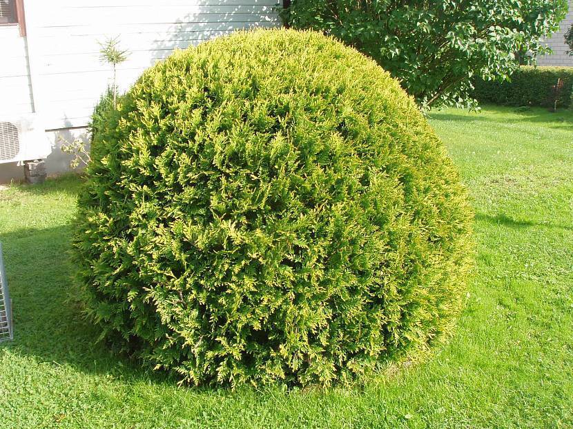 Туя западная «даника» Thuja occidentalis Danica. Датские селекционеры вывели это карликовое деревцо в 1948 году. Во взрослом виде культура достигает 0,5 – 0,8 м высоты, представляя собой шар идеально округлой формы густо-зелёного цвета, с кроны диаметром около одного метра. Её поверхность образуют вееровидные ветки, располагающиеся в правильном вертикальном направлении, поэтому кажется волнистой.