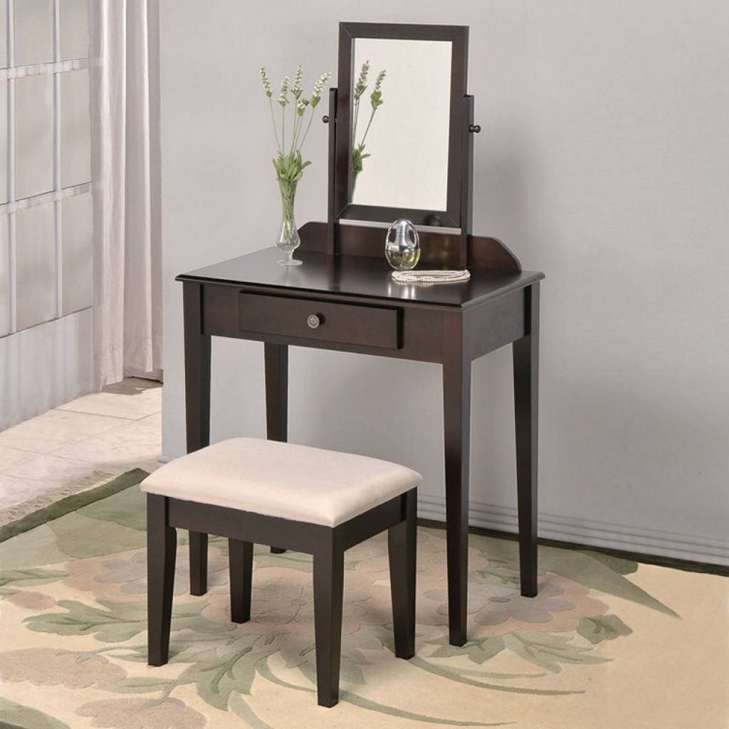 В небольшой спальне туалетный столик нередко выполняет дополнительную функцию прикроватной тумбы или рабочего места. В таком случае лучше выбирать раскладные модели с откидывающимся зеркалом. Подойдут и столы, не загроможденные отсеками и полками на поверхности. Следует позаботиться о подведении электричества, для того, чтобы поставить на стол электронные приборы, например, ноутбук. Лучше всего, если небольшой, но комфортный стул будет задвигаться под стол.