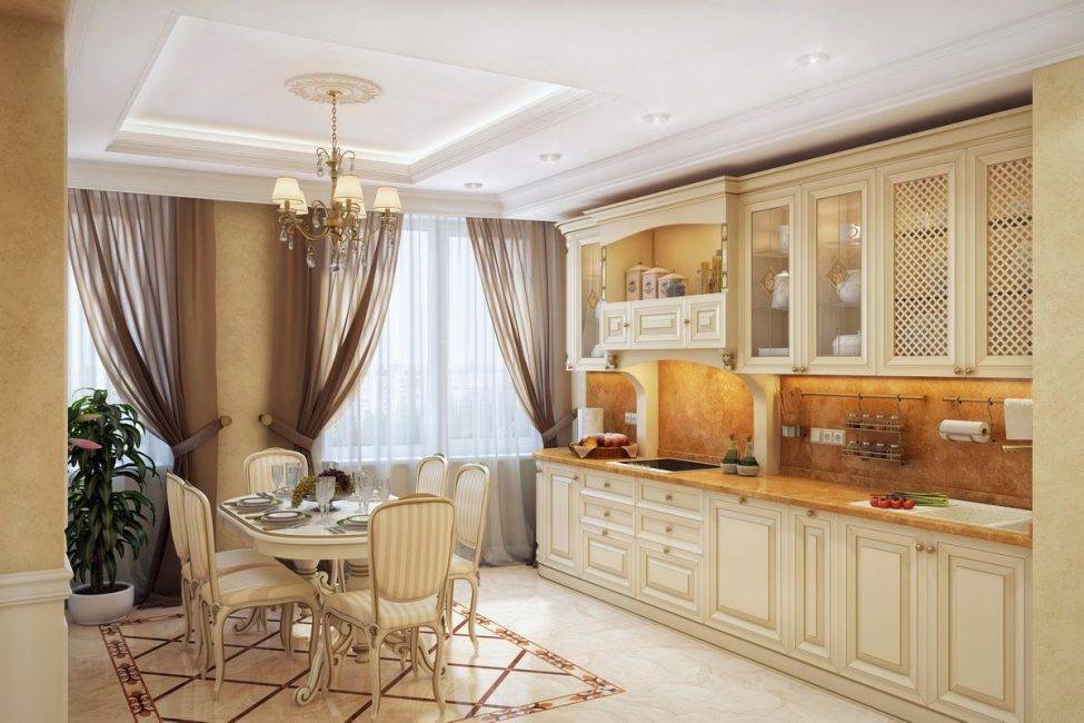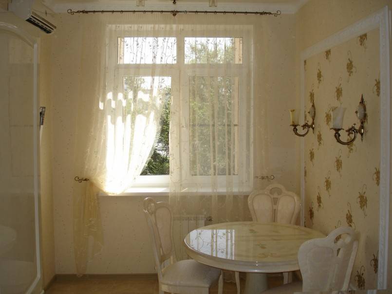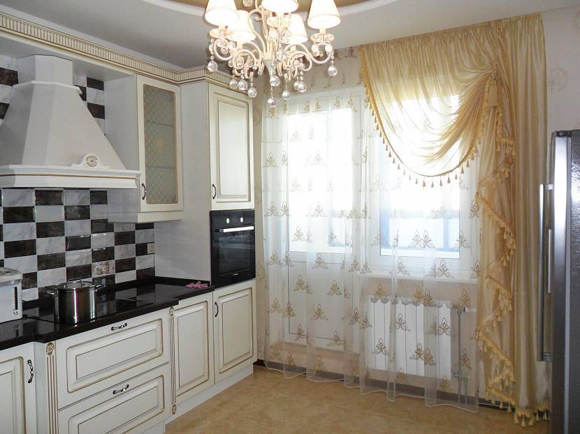 И наоборот, прозрачная кисея без поддержки массивных гардин напрочь потеряется в формате просторной неоклассической кухни.