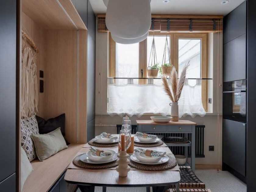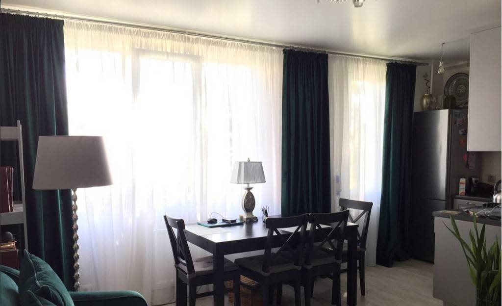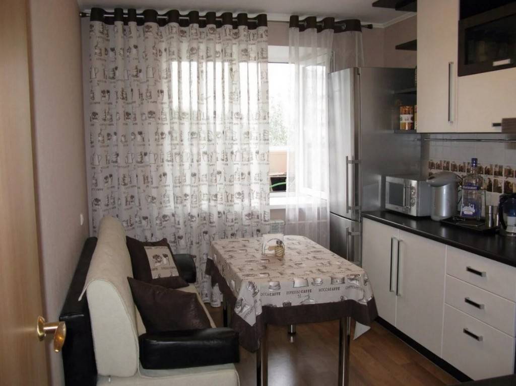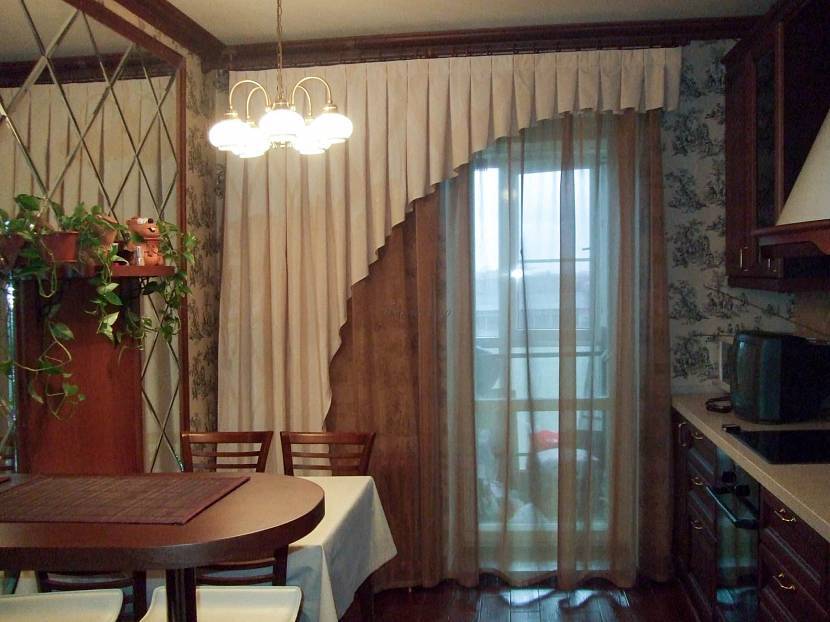 Отличным вариантом будет применение штор на одну сторону на кухне, которая имеет выход на лоджию или балкон. Такое решение позволит свободно передвигаться между комнатами, не убирая ткань.
