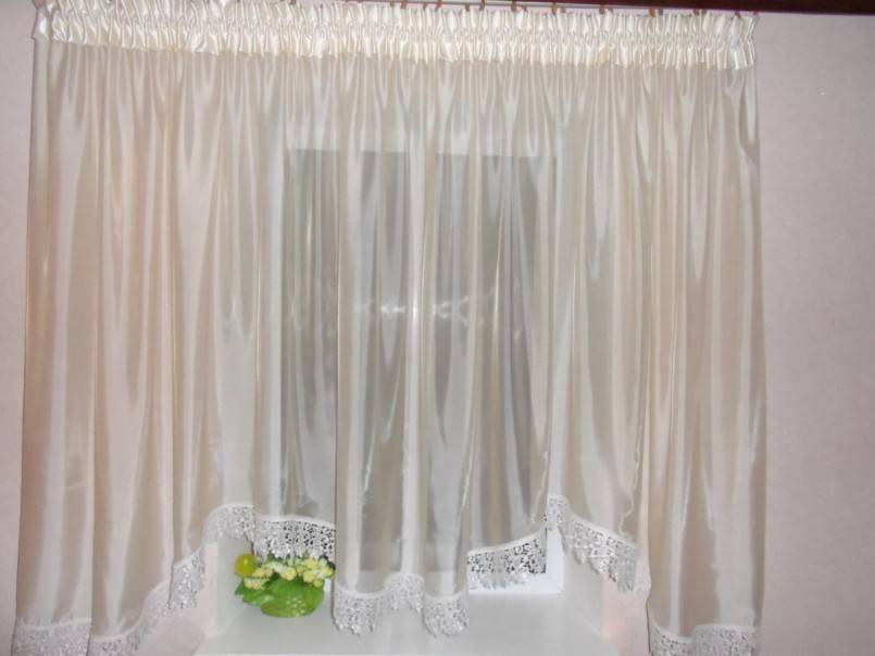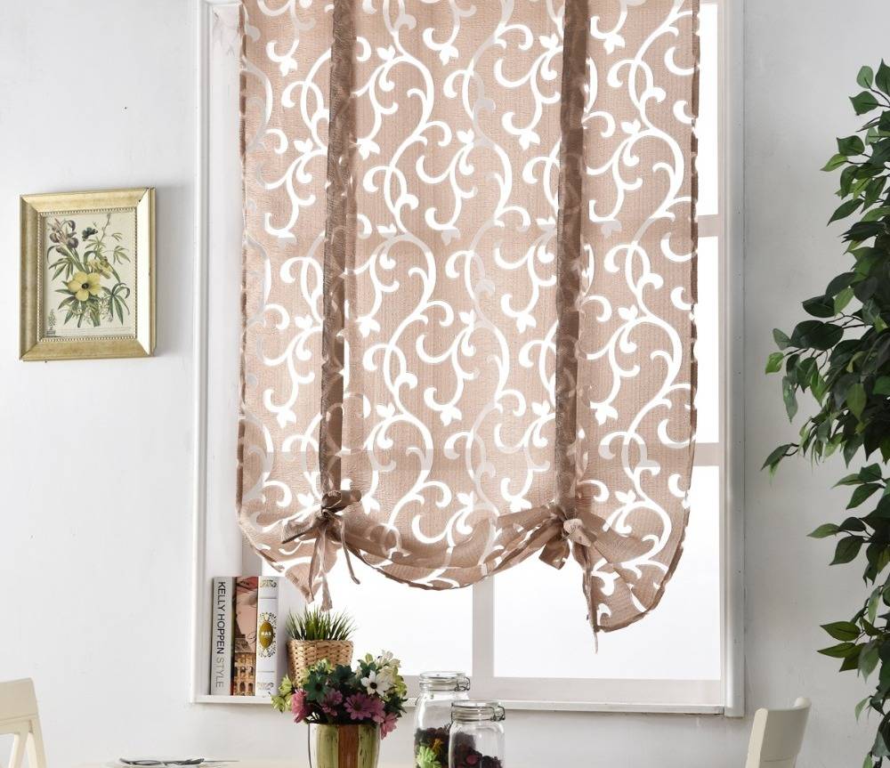 Такие шторы выполняются из простой ткани, которая не требует прихотливого ухода. Внизу шторы сделайте оборки из атласной ленты, этот элемент придаст занавеске и вашей кухне романтичность, простоту.