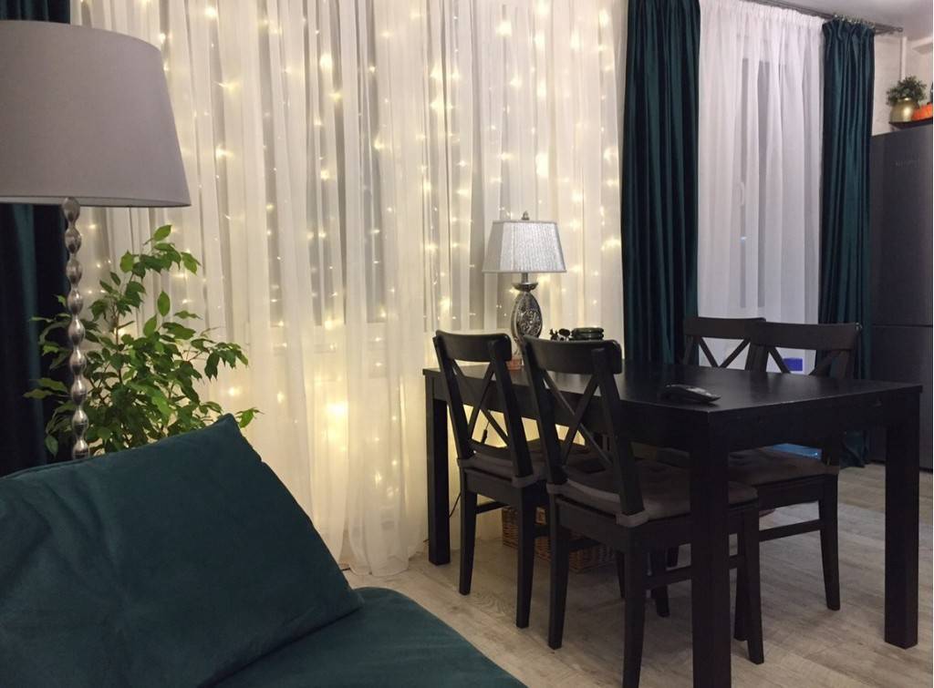 Дополнение дизайна – без штор помещение выглядит каким-то необжитым и голым. Если повесить шторы, то сразу становится так по-домашнему уютно