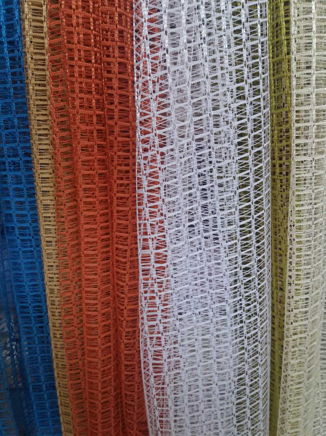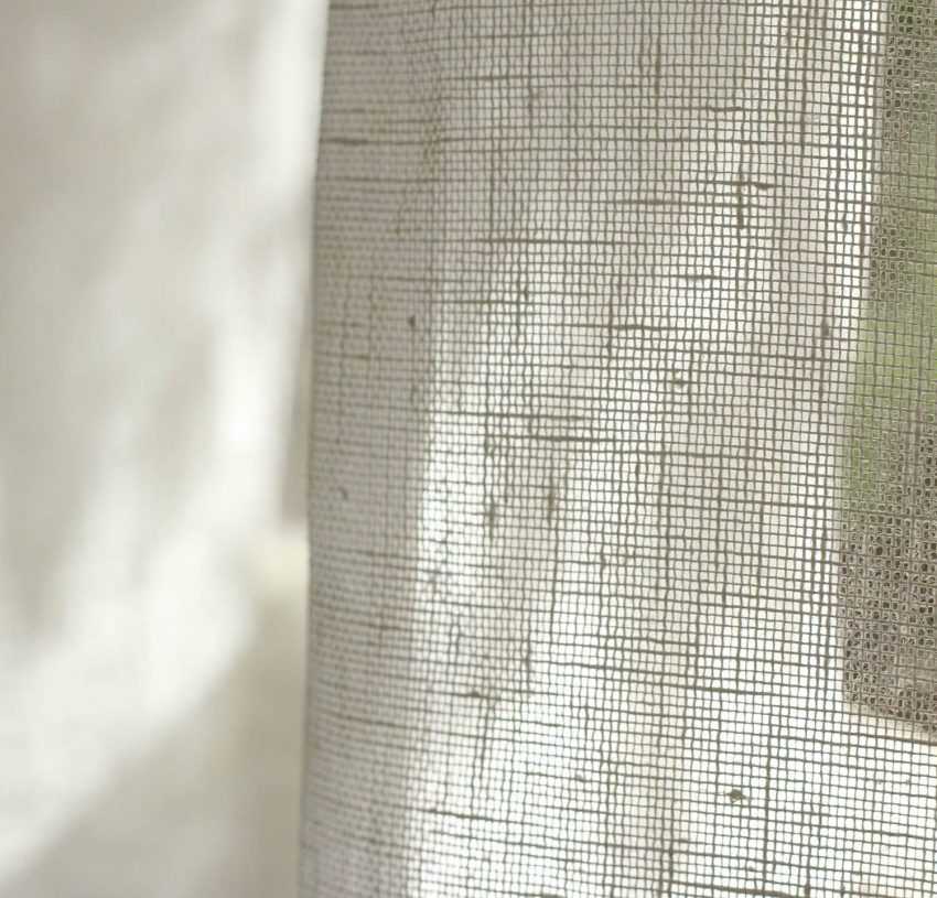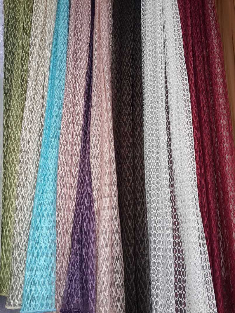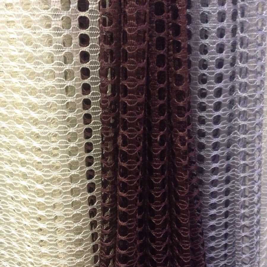 Сетка имеет дырчатую структуру. Занавески пропускают воздух и свет солнца, но быстро накапливают пыль и требуют частой стирки. На ней выполняют вышивку шелковыми нитями, которая смотрится эффектно.