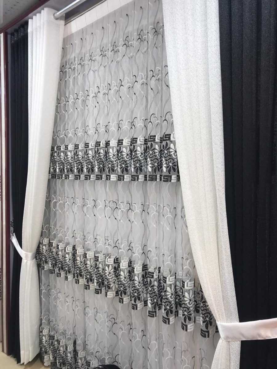Не возбраняется применение двойного типа занавесок, когда, помимо тюля, вывешиваются в два ряда разные по тонам шторы. Это могут быть сочетания черных и серых, голубых, цвета металлик, либо занавесок нежных пастельных оттенков. Притом гардину следует подобрать в тон одного из оттенков, в том числе и черную.