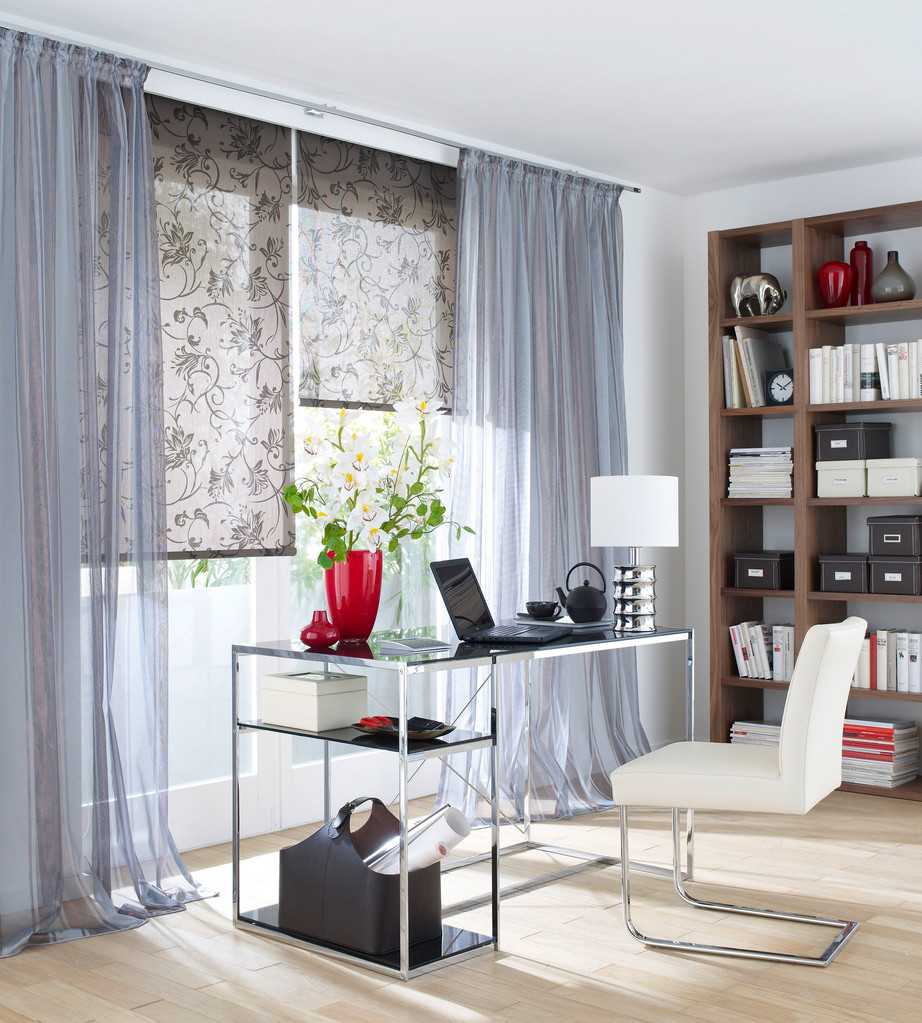 Тюль отлично сочетается как с плотными портьерными шторами, так и с рулонными, римскими шторами и жалюзи. Сочетание тканей и фактур позволяет экспериментировать с дизайном интерьера, а также регулировать уровень освещенности в помещении: