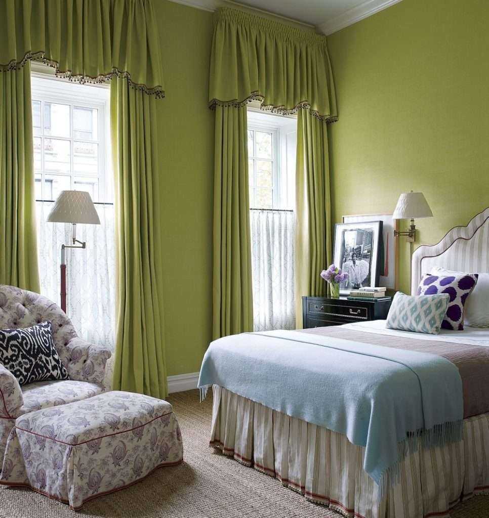 Остановив выбор на подобной палитре для обустройства комнаты, человек создаёт место для отдыха. А такой атрибут, как занавески зелёных оттенков, позволят зрительно придать пространству объёма. Однако их лучше дополнить белоснежным тюлем.