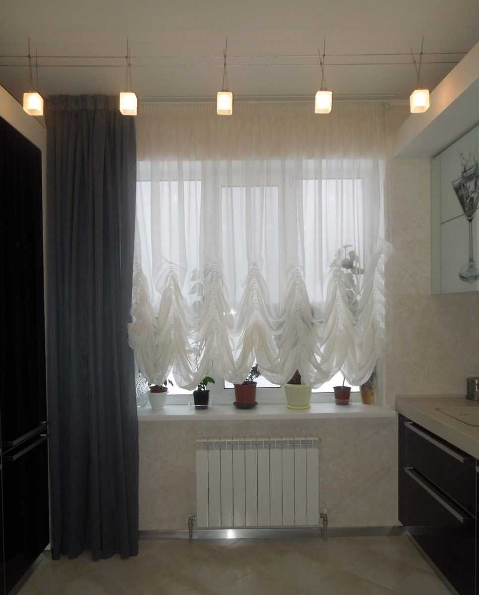 Здесь всё зависит от площади и дизайна кухонной локации. Если метраж позволяет, то можно смело покупать тюлевые занавески длиной в пол. Они займут минимум места, а ещё визуально увеличат высоту стен, добавив помещению объёма